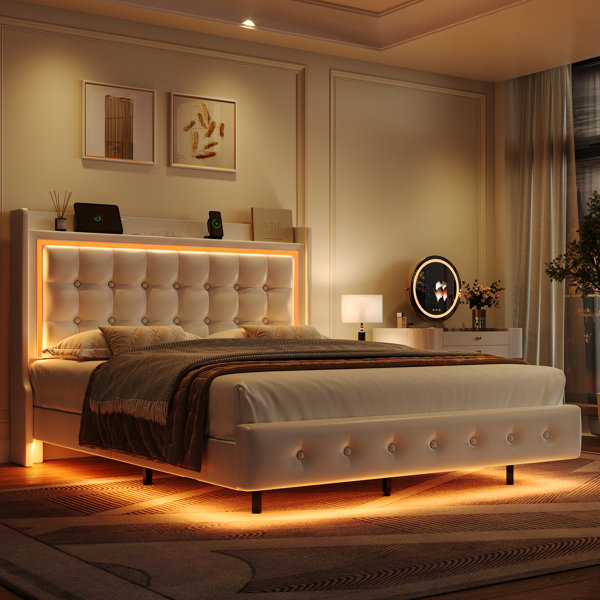 Upholstered Platform Bed with LED Lights, Charging Port, Floating Bed
